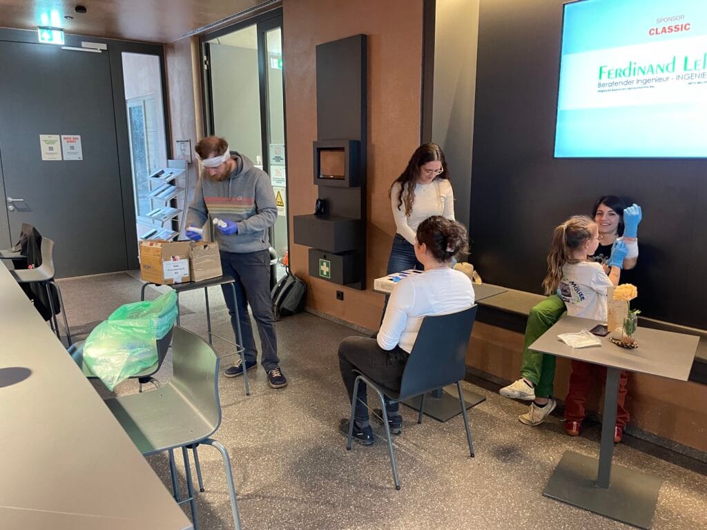 Die Kurse waren alles andere als trocken: Neben der Theorie stand vor allem das praktische Üben im Vordergrund. Wir konnten verschiedene Szenarien durchspielen, Verbände anlegen und direkt ausprobieren, wie man in unterschiedlichen Notfallsituationen richtig reagiert. Dabei ging es nicht nur um die medizinischen Maßnahmen, sondern auch um das „Drumherum“ – also wie man mit betroffenen Personen kommuniziert, andere Gäste einbindet und die Situation in der Halle organisiert.